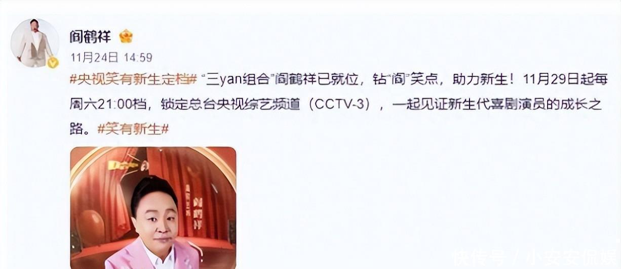 而且老郭向来挺帮衬他的,这么多年来,从没说过师父一句坏话,最近还开始帮老郭出彩了。开始争号那天,他在社交平台上宣布了自己要主持央视的《笑有新生》节目,还配了一张海报图。海报上他穿着粉色西装,里面配着白衬衫,发型也整理得干净利落,看起来挺精神的。右上角还印着一大块央视的标志。